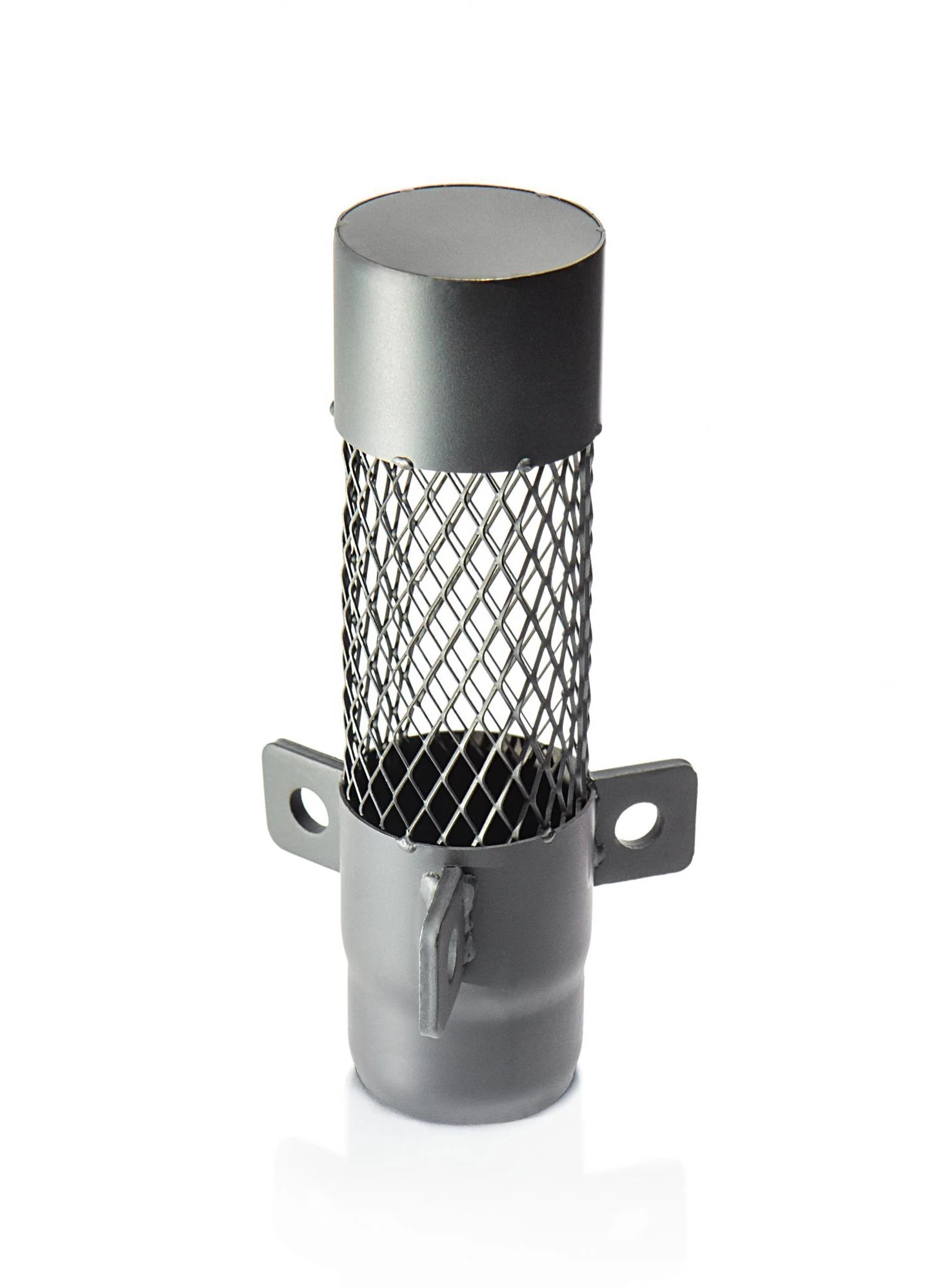 Funkenfang – Um den Loki sicher und umweltbewusst anzufeuern, empfiehlt Petromax den Funkenfang. Das zylinderförmige Metallgitter wird auf das letzte Ofenrohr aufgesteckt und aufsteigende Funken oder glühenden Teilchen erlöschen, bevor sie am Zelt oder in der Natur Schaden anrichten können. Da der Funkenfang zusätzliche an den drei Ösen mit Seilen am Zelt oder im Boden fixiert werden kann, sitzt er auch bei starkem Wind fest auf dem Ofenrohr. Zusätzlich kann der Funkenfang auch als Verschluss bzw. Abdichtung für eine der Zeltdurchführungen genutzt werden, sollte der vielseitige Ofen einmal abgebaut werden.