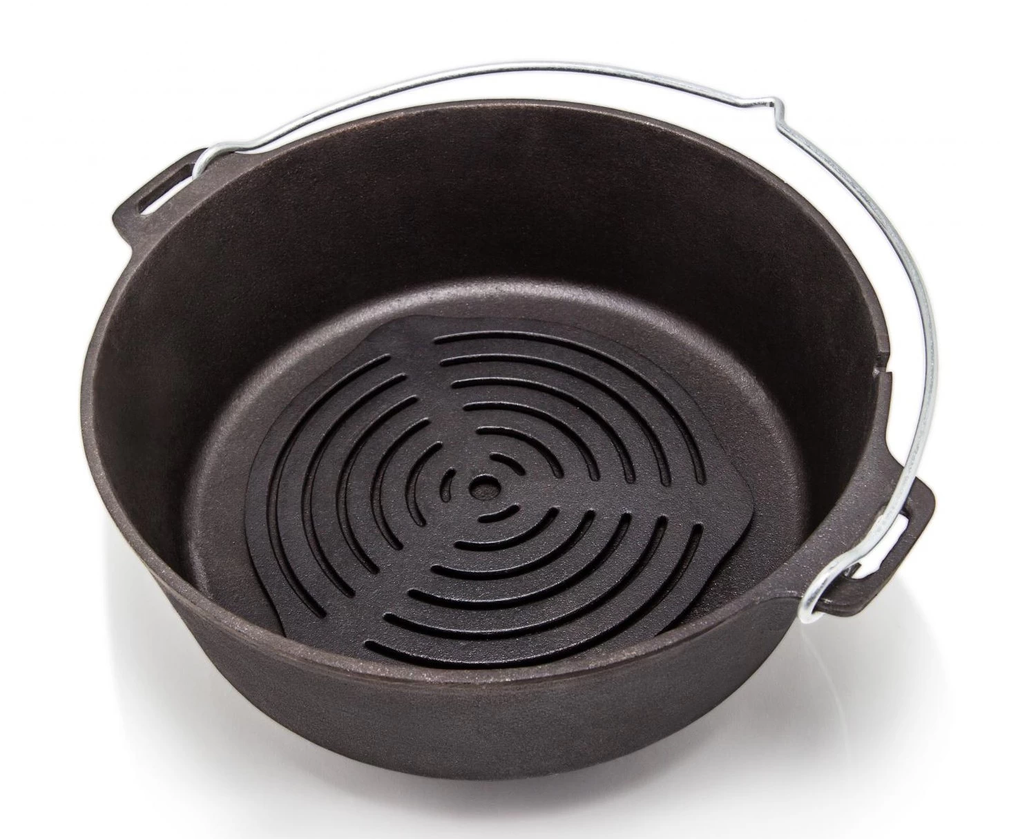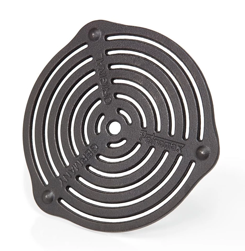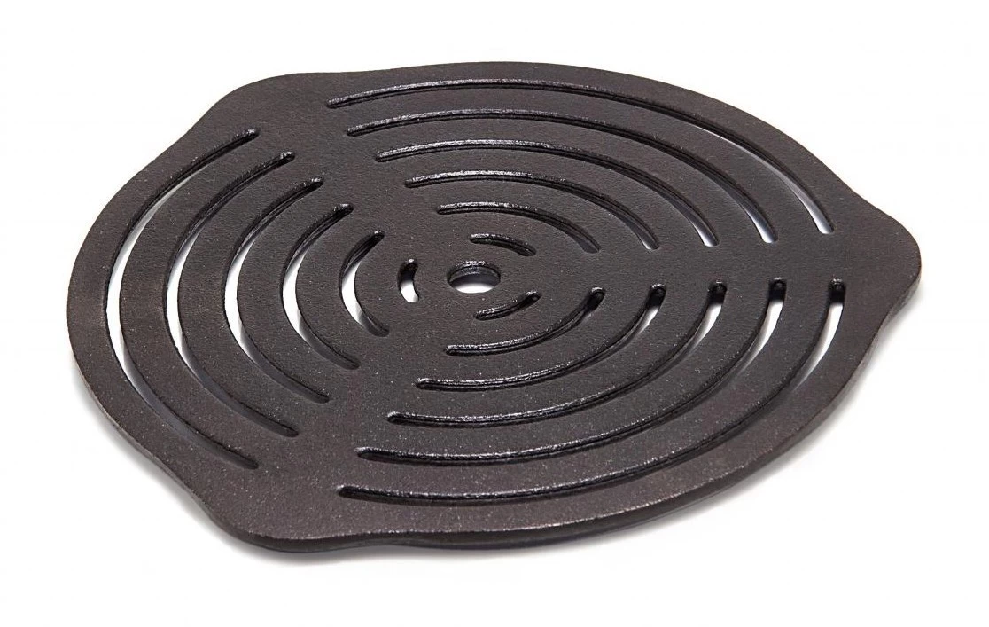 Gussrost-Einsatz – sorgt für eine erstklassige Hitzeverteilung und ermöglicht das Backen und Garen in den Feuertöpfen ohne Anbrennen. Auf drei Noppen steht der Gussrost-Einsatz sicher im Feuer, auf dem Tisch als Untersetzer. Beim direkten Grillen in der Glut brutzelt er das perfekte Grillmuster ins Fleisch.