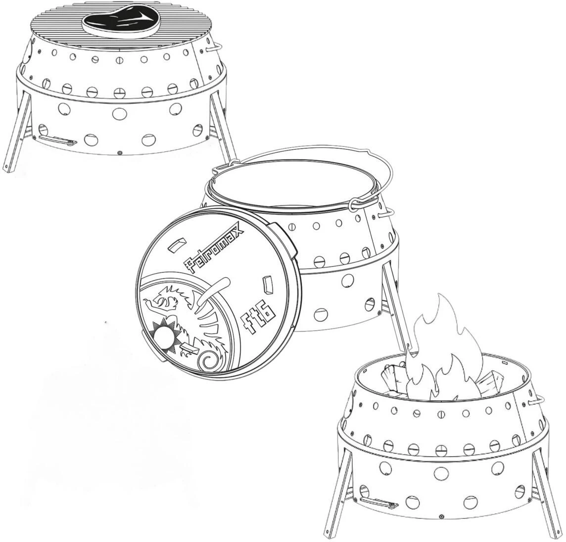 - Transport- und Lagermöglichkeit für den Feuertopf ft12, ft18, den Feuergrill tg3 oder den Petromax Atago