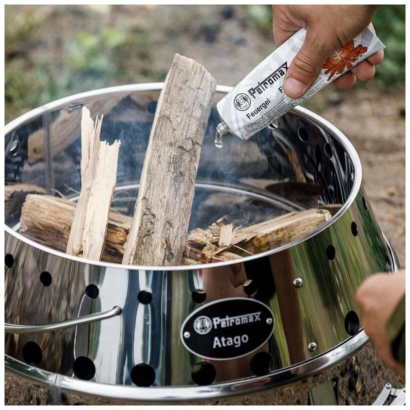 Der Atago is ein absoluter Allrounder und kann als Grill, Ofen, Herd und Feuerschale verwendet werden. Zum Anfeuern eignen sich Holzkohle, Holzkohlebriketts und Feuerholz. Ausgehend von seinen vier Grundfunktionen ergeben sich zahlreiche Garmethoden und Zubereitungsvarianten. In Kombination mit einem Petromax Feuertopf oder Grill- und Feuerschale wird er zu einem erstklassigen Ofen und Herd. Dazu wird ein gusseiserner Feuertopf (z. B. der ft1, ft3, ft6 oder ft9) einfach auf die glühenden Briketts im Atago gestellt. Für Pfannengerichte kann eine Grill- und Feuerschale ohne Beine (beispielsweise fs48 oder fs56) oben auf der runden Öffnung platziert werden. Da die Schale oder der Feuertopf vom Atago umgeben wird, ist für eine optimale Hitzeausbeute gesorgt. Um das Produkt ganz klassisch als Grill zu nutzen, legt man den im Lieferumfang enthaltenen Grillrost auf. Ohne Grillrost verwendet, kann mit einem Perkolator oder Teekessel ein Heißgetränk zubereitet oder ein gemütliches Lagerfeuer für den Abend entzündet werden. Durch den einzigartigen Klapp-Mechanismus ist die innovative Grill-Ofen-Herdkombination mit nur einem Handgriff einsatzbereit oder zum Transport zusammengefaltet. Mit einer Höhe von nur 15 cm im eingeklappten Zustand kann er hervorragend und platzsparend verstaut werden.