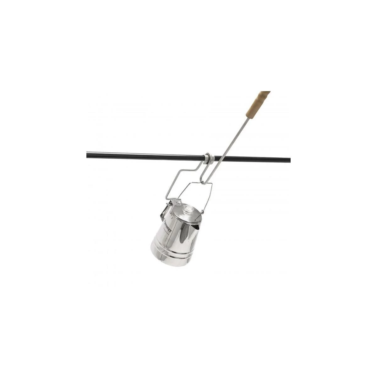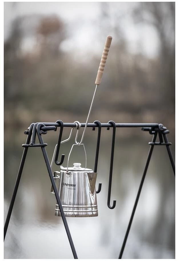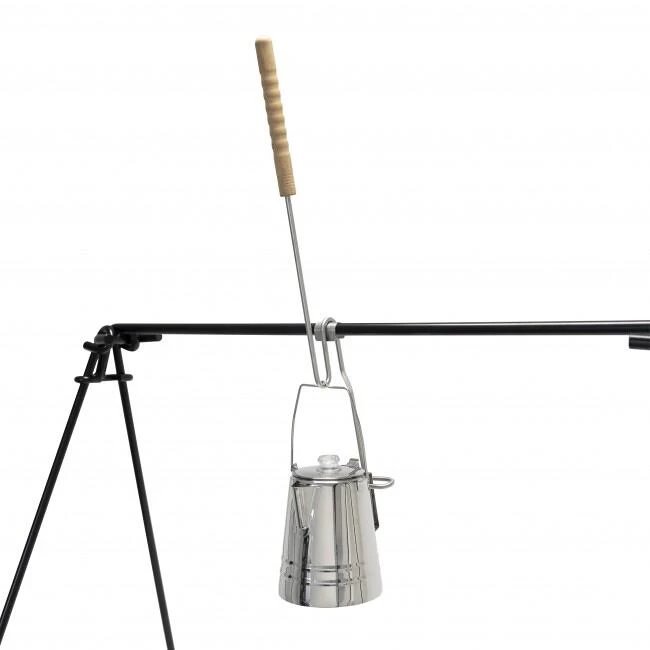 Kleines Werkzeug mit großem Effekt: Mit der Ausgießhilfe für den Edelstahl Perkolator schenkst du gezielt Kaffee für die ganze Runde aus. Henkel und Griff deines Perkolators werden sicher in dem Gestänge eingehakt. So fixiert hängst du die Ausgießhilfe einfach neben dein brutzelndes Fleisch an die Querstange deiner Feuerbrücke. Über dem Feuer kocht wie gewohnt dein kräftiger Kaffee oder aromatischer Tee und mit einer simplen Kippbewegung schenkst du der müden Meute – einem nach dem anderen – eine wärmende Tasse ein. So geht kein Tropfen mehr daneben. Da die Ausgießhilfe mit einem Griffstück aus naturbelassenem Buchenholz versehen ist, ist dir der sichere Umgang mit der heißen Kanne sicher. Und muss der Perkolator neu befüllt werden für die nächste Runde, so kannst du ihn gefahrlos mit der Ausgießhilfe vom Feuer nehmen.