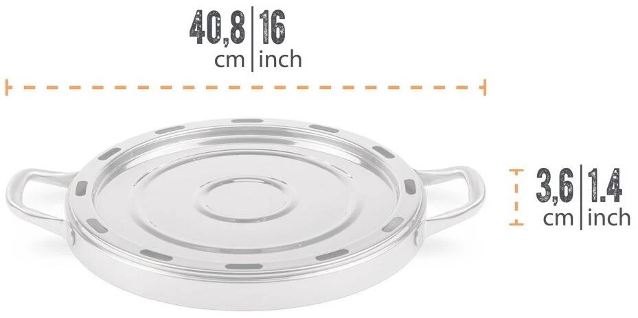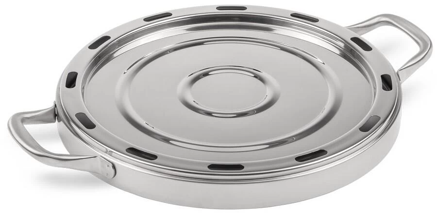 Rundes Pizzablech aus Edelstahl in Kombination mit dem Camping Backofen: zwei Gerichte gleichzeitig kochen