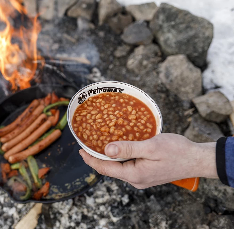 In den Petromax Emaille Schalen in drei verschiedenen Größen servieren Draußen-Köche heiße und kalte Speisen. Herzhafte Bratkartoffeln, deftige Eintöpfe, Müsli oder Dips: für jedes Gericht ist eine passende Schale dabei.