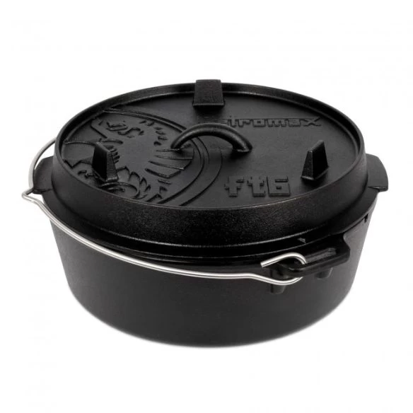 Durch die hervorragenden Eigenschaften des Gusseisens und die spezielle Oberflächenstruktur wird die Wärme effizient gespeichert und weitergeleitet. Die vorbehandelte Oberfläche (seasoned finish) macht ein erstmaliges Einbrennen unnötig und der robuste Feuertopf kann sofort verwendet werden. Im Freien wird er auf dem offenen Feuer oder mit Holzkohle verwendet. Der erhöhte Rand des Deckels ermöglicht es, Glut oder Holzkohle auch auf dem Feuertopf zu platzieren. So wird der Feuertopf von allen Seiten beheizt und eignet sich beispielsweise auch zum Brot backen.