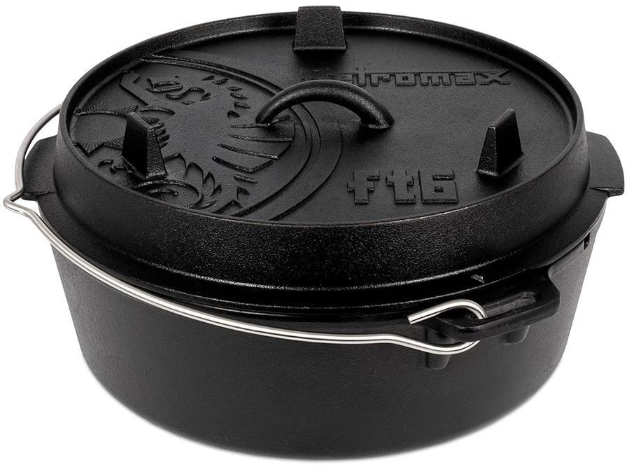Die Zubereitung von Fleisch und Gemüse über dem offenen Feuer, oder auch im heimischen Backofen kann so einfach sein. Mit einem sogenannten Dutch Oven garen Speisen sehr schonend im eigenen Saft. Er ist prima geeignet für das Kochen beim Reisen, Camping oder im heimischen Garten. Den FT6 gibt es mit oder ohne Standfüße als Set mit Deckelheber. Der FT6 ist, wie auch die anderen Petromax Feuertöpfe, der ideale Outdoor Begleiter. Der robuste Topf kann problemlos direkt in der Glut platziert werden, das Gusseisen sorgt für eine gleichmäßige Wärmeverteilung. Der Deckel des Feuertopfs kann zudem als Servierplatte oder Pfanne genutzt werden. Dank der vorbehandelten Oberfläche (seasoned finished) ist der FT 6 sofort verwendbar.