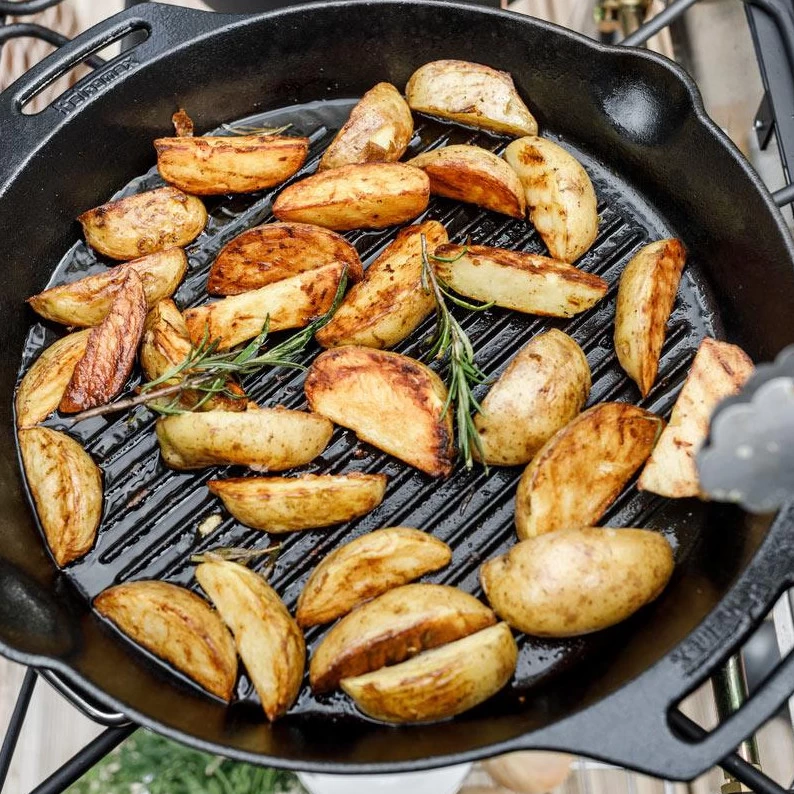 Dabei verhindert die mit jedem Gebrauch stärker werdende Patina das Anhaften deines Grillguts. Dieser chemiefreie Anti-Hafteffekt kommt auf natürliche Weise zustande und macht die Grill-Feuerpfanne im Laufe der Zeit noch robuster und widerstandsfähiger. Je stärker die Patina ausgebildet ist, desto weniger Öle und Fette benötigst du beim Zubereiten. Speiseflüssigkeiten sammeln sich in den Rillenvertiefungen und zurück bleiben die typischen Röststreifen und ein unvergleichliches Aroma.