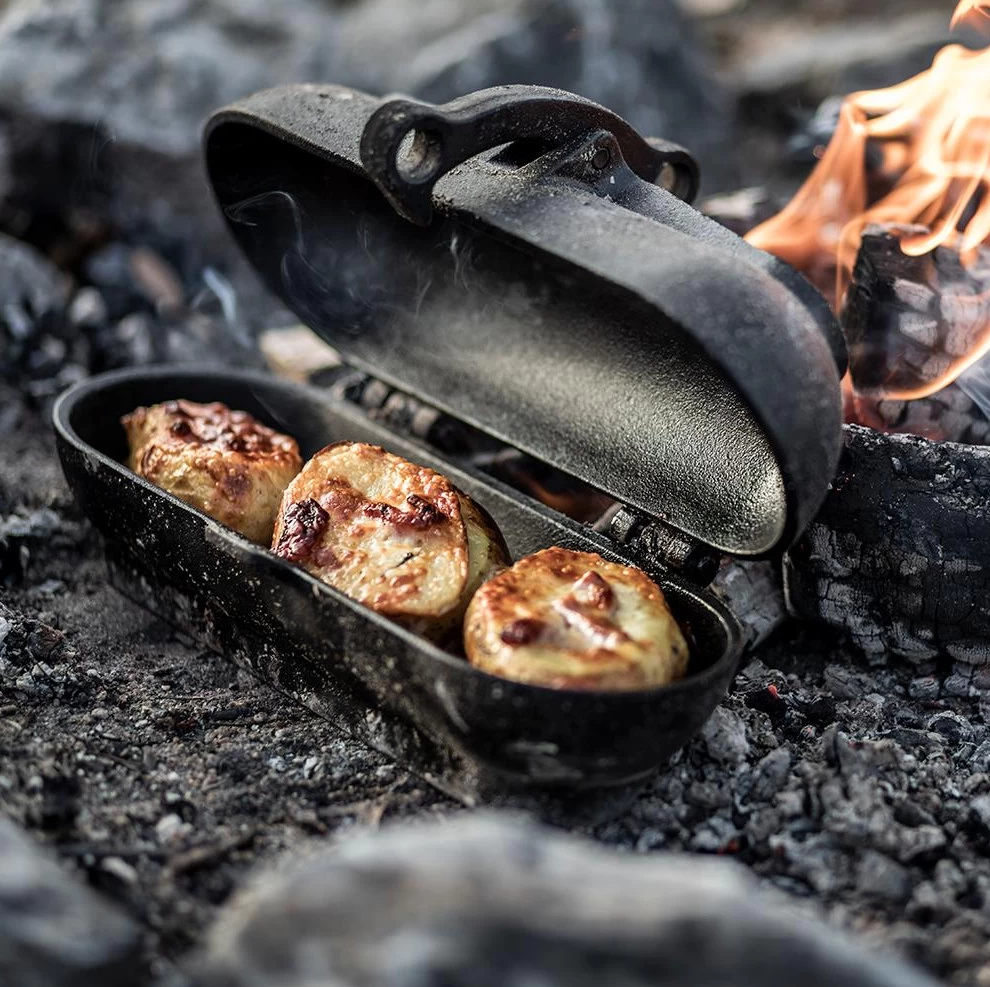 In der Glut gebackene Kartoffeln, ob als Hauptspeise oder als Beilage zu saftigen Steaks, passen perfekt zu einem Abenteuermenü. Mit dem gusseisernen Kartoffelbräter bereitest du Kartoffeln und Gemüse mit dem charakteristischen Röstgeschmack zu.