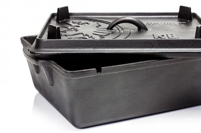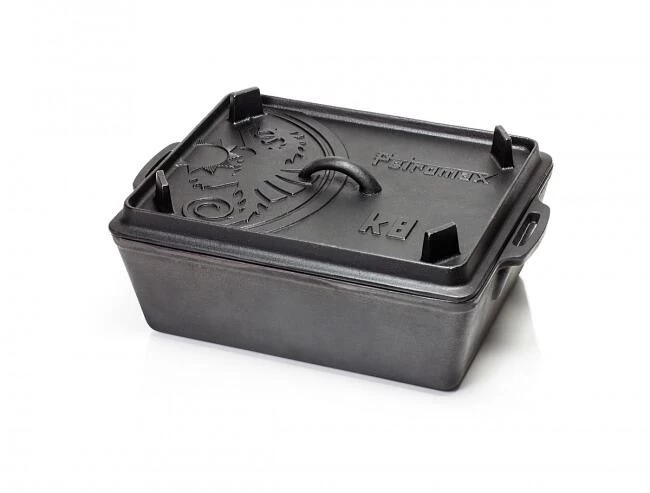 Der geräumige Petromax K8 Gusseisenbräter ist perfekt für Brot, Braten, Auflauf und viele andere Leckereien. Der große Deckel dieses kantigen Dutch Oven kann über dem offenen Feuer gut als Grillplatte genutzt werden. Auf der gusseisernen Kastenform lässt er sich beim Outdoor-Kochen mit Glut oder Briketts bestücken. So entsteht eine hervorragende Rundumwärme. Aber auch im Backofen kann die K8 Guss-Kastenform prima als Bräter, Kuchen- oder Brotbackform verwendet werden. Die Kastenform ist die ideale Ergänzung der Petromax Gusseisen-Produkte, der Gardeckel kann genau wie bei den anderen Feuertöpfen mit dem Deckelheber abgenommen werden.