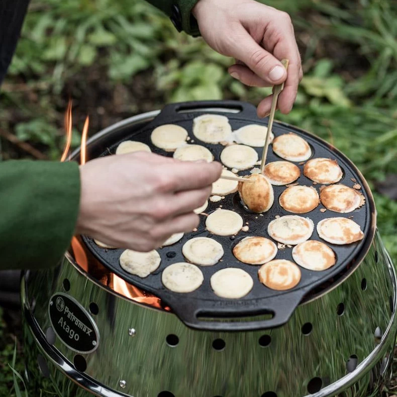 Ob du mit offenem Feuer oder über der heißen Glut deines Grills kochst: Die Poffertjespfanne versüßt dir in allen Lagen den Einsatz. Dabei garantieren dir die beiden Henkel eine sichere Handhabung. Zusätzlich passt die Pfanne mit einem Durchmesser von 30 cm optimal in deinen Petromax Atago und liegt am oberen Rand auf. Auch zu Hause musst du nicht auf den unverwechselbaren Geschmack verzichten, denn die Unterseiten der 30 Backmulden sind abgeflacht. Dadurch steht die Poffertjespfanne auf dem Backblech stabil und kann sowohl im Ofen als auch auf allen gängigen Herdarten genutzt werden.