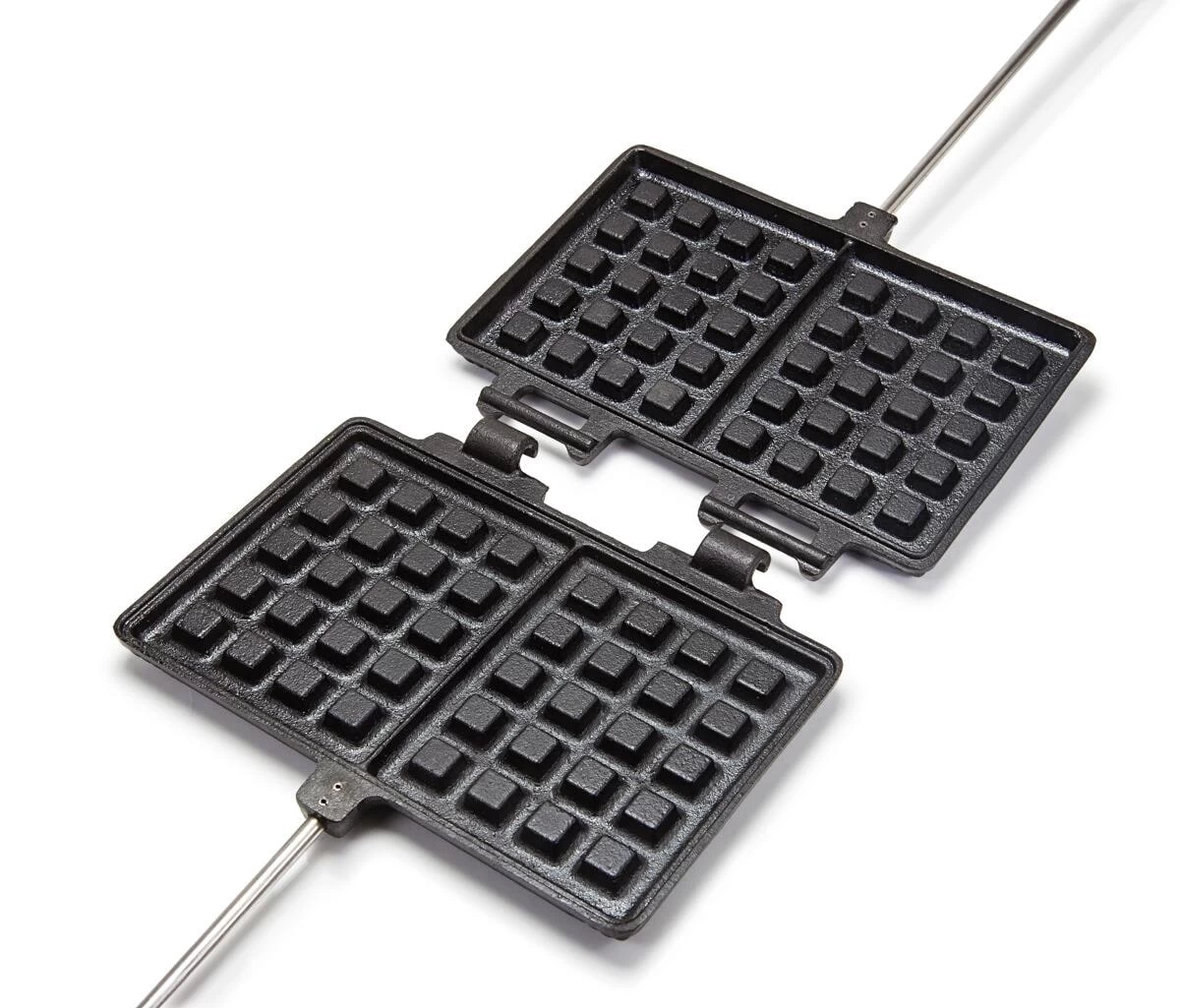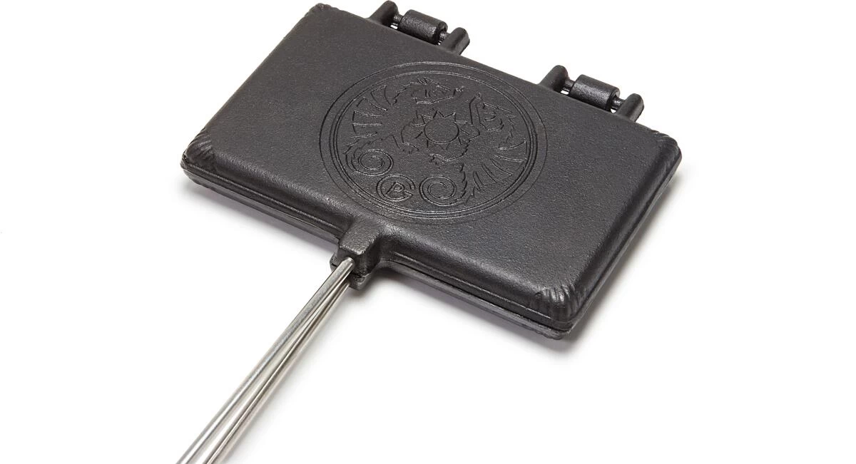 Das Petromax Waffeleisen bereichert die Outdoor-Küche um eine weitere Dessertvariation. Die gusseiserne Form backt zwei Waffeln der Größe 9 x 11 cm und ist dank ihrem ’seasoned finish‘ sofort einsatzbereit. Einfach das Waffeleisen gut vorheizen, den Waffelteig einfüllen, die Form gegebenenfalls noch einmal in der Hitze drehen und schon ist das leckere Gebäck fertig. Der praktische Verschlusshaken hält die Waffelformen zusammen, sodass der Teig nicht herausläuft. Dank der Scharniere lassen sich die Gusshälften zum Reinigen auseinander nehmen. Ob auf dem Grill oder am Lagerfeuer, in jedem Fall sorgt der lange Stab mit den Holzgriffen für ausreichend Abstand zur Wärmequelle und eine sichere Anwendung.