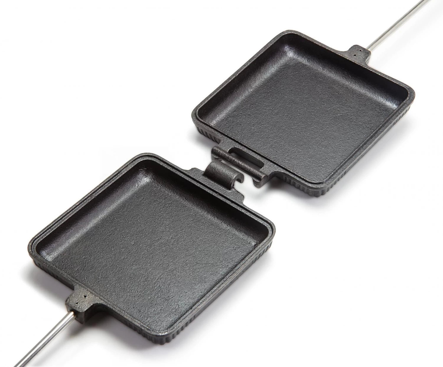 Sandwicheisen sw-iron – eignet sich perfekt für Toasts, Bagels oder Teigtaschen. Ob am Lagerfeuer oder auf dem Grill: Toastbrot wird knusprig geröstet und die Füllung – herzhaft oder süß – wird lecker saftig. Die gusseisernen Formen sind ideal für Toastscheiben der Größe 11 x 11 cm und dank des seasoned finish sofort einsatzbereit. Weil das Material die Hitze perfekt speichert, können Sandwiches und Co. auch mit der Restwärme gebacken werden. Der praktische Verschlusshaken hält die Toastpfannen zusammen, sodass nichts herausfällt. Zum Reinigen lassen sich die Gusshälften über einen Scharnier voneinander trennen.