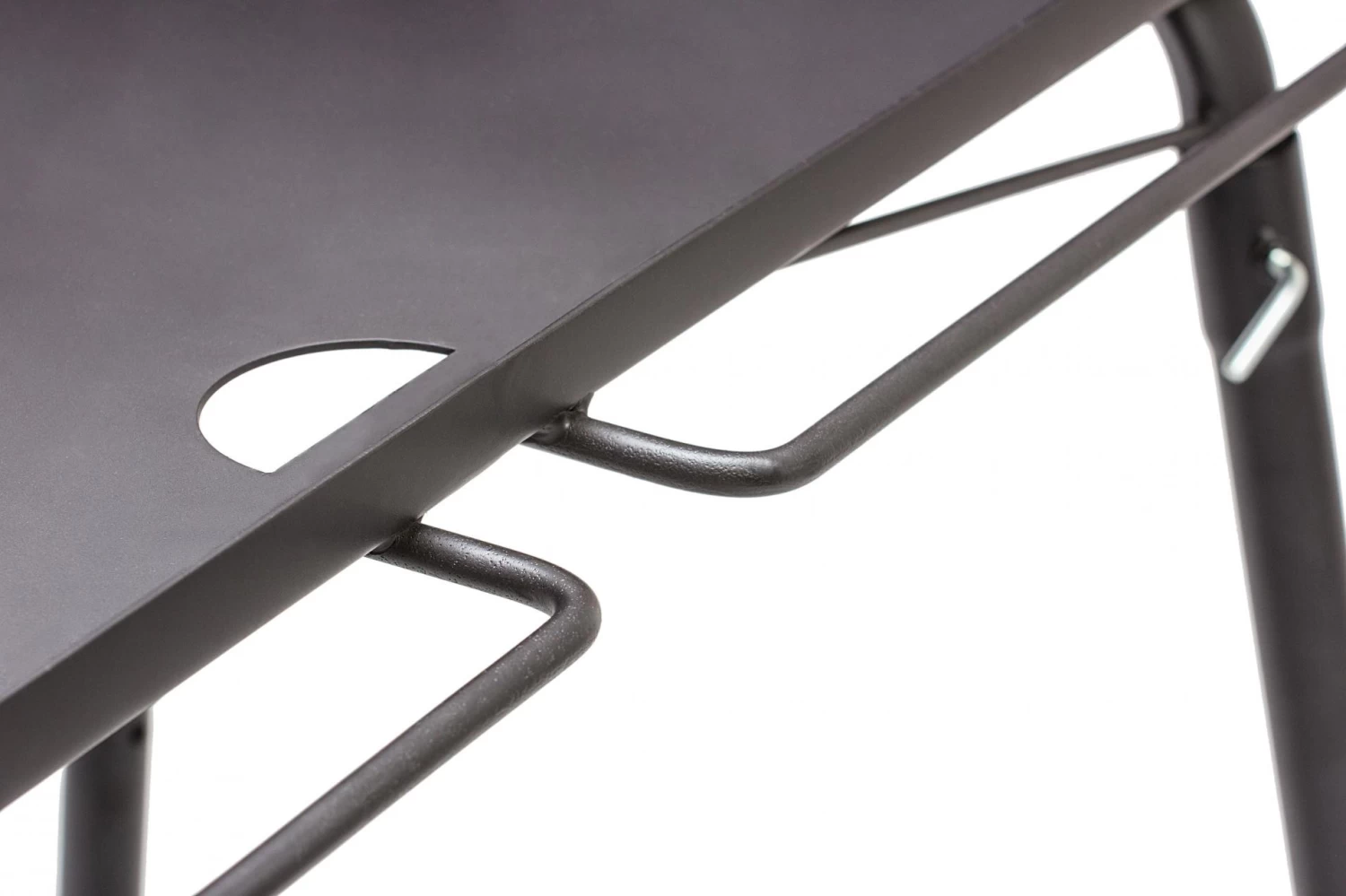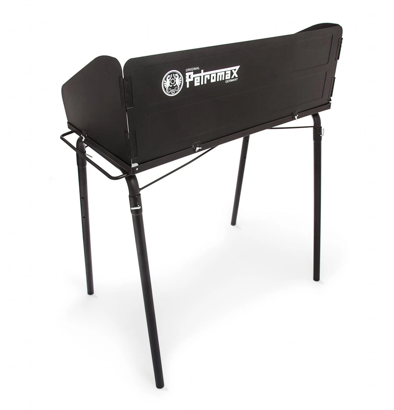 Draußen kochen im großen Stil: Der Petromax Feuertopf Tisch fe90 bietet eine sichere Stand- und Kochfläche für Feuertöpfe in angenehmer Arbeitshöhe von 87 cm. Auf dem belastbaren Stahltisch finden je nach Größe mehrere Feuertöpfe Platz. Der großzügig bemessene Windschutz garantiert auch im Freien energie- und kohleeffizient zu kochen. Die vier Standbeine können alternativ auch abgebaut und der Tisch auf eine beliebige, hitzeresistente Unterlage gestellt werden. Vorn und an den Seiten bieten Bügel Platz zum Aufhängen von Kohlezange, Grillhandschuhen und Co. Zum Säubern lassen sich Asche und Kohlereste einfach durch eine Aussparung im vorderen Bereich der Arbeitsfläche ausfegen.