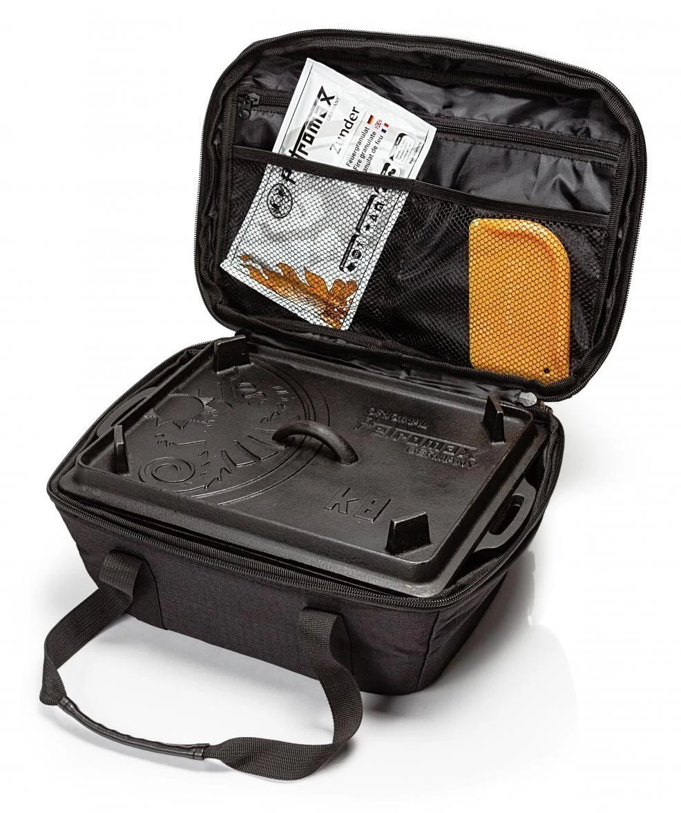Transporttasche für Kastenform k8 – In dieser Transporttasche kann die Kastenform k8 einfach und elegant verstaut werden. Die Tasche aus robustem Ripstop-Gewebe, bestickt mit dem Petromax Logo bietet somit eine sichere und hochwertige Transport- und Aufbewahrungsmöglichkeit. Der Taschendeckel beherbergt im Inneren eine geräumige Reißverschlusstasche sowie zwei Netzeinschubtaschen. So können Zubehör-Teile wie z. B. Petromax Zunder, Mini- oder Profi-Gasbrenner einfach verstaut und mitgeführt werden.